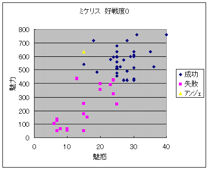 ミケリスの捕獲ライン(好戦度0)は上のグラフの通り。
